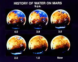 The possibility of life on Mars is a subject of interest in astrobiology due to the planet's proximity and similarities to Earth. To date, no conclusive evidence of past or present life has been found on Mars. Cumulative evidence suggests that during the ancient Noachian time period, the surface environment of Mars had liquid water and may have been habitable for microorganisms, but habitable conditions do not necessarily indicate life.[1][2] Scientific investigations for potential life on Mars began in the 19th century and continue today with telescopes and robotic probes searching for water, chemical biosignatures in the soil and rocks at the planet's surface, and biomarker gases in the atmosphere.[3]