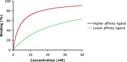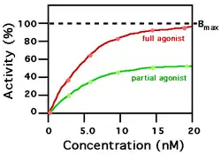 Low-affinity binding (high Ki level) implies that a relatively high concentration of a ligand is required before the binding site is maximally occupied and the maximum physiological response to the ligand is achieved. In the example shown to the right, two different ligands bind to the same receptor binding site. Only one of the agonists shown can maximally stimulate the receptor and, thus, can be defined as a full agonist. An agonist that can only partially activate the physiological response is called a partial agonist. In this example, the concentration at which the full agonist (red curve) can half-maximally activate the receptor is about 5 x 10−9 Molar (nM = nanomolar).
