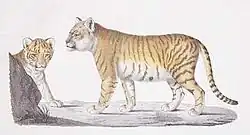 The history of lion–tiger hybrids dates to at least the early 19th century in India. In 1798, Étienne Geoffroy Saint-Hilaire (1772–1844) made a colour plate of the offspring of a lion and a tiger. The name "liger", a portmanteau of lion and tiger, was coined by the 1930s.[4] "Ligress" is used to refer to a female liger, on the model of "tigress".