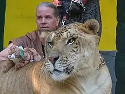 The liger is a hybrid offspring of a male lion (Panthera leo) and a tigress, or female tiger (Panthera tigris). The liger has parents in the same genus but of different species. The liger is distinct from the opposite hybrid called the tigon (of a male tiger and a lioness), and is the largest of all known extant felids.[1][2] They enjoy swimming, which is a characteristic of tigers, and are very sociable like lions. Notably, ligers typically grow larger than either parent species, unlike tigons.[1][2][3]