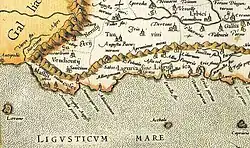 The name Liguria predates Latin and is of obscure origin. The Latin adjectives Ligusticum (as in Mare Ligusticum) and Liguscus[4] reveal the original root of the name, ligusc-: in the Latin name -sc- was shortened to -s-, and later turned into the -r- of Liguria, according to rhotacism. Compare Ancient Greek: λίγυς, romanized: Lígus, lit. 'a Ligurian, a person from Liguria' whence Ligustikḗ λιγυστική transl. the name of the place Liguria.[5] The name derives from the ancient Ligures people, although the territory of this people was much larger than the current administrative region; it included all of North-west Italy south to the Po river, and south-eastern France.