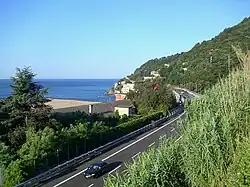 The Italian Riviera or Ligurian Riviera is the narrow coastal strip in Italy which lies between the Ligurian Sea and the mountain chain formed by the Maritime Alps and the Apennines. Longitudinally it extends from the border with France and the French Riviera (or Côte d'Azur) near Ventimiglia (a former customs post) eastwards to Capo Corvo (also known as Punta Bianca) which marks the eastern end of the Gulf of La Spezia and is close to the regional border between Liguria and Tuscany. The Italian Riviera thus includes nearly all of the coastline of Liguria. Historically the "Riviera" extended further to the west, through what is now French territory as far as Marseille.[8][9]