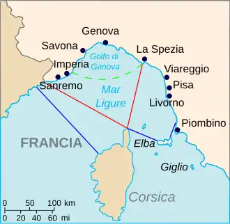 The Ligurian Sea[a] is an arm of the Mediterranean Sea. It lies between the Italian Riviera (Liguria) and the island of Corsica. The sea is thought to have been named after the ancient Ligures people.