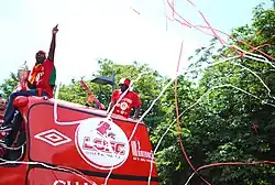 In the 2020 summer transfer window, Lille chose to sign young talents Sven Botman and Jonathan David as well as veteran Burak Yılmaz.[28] At the end of the 2020–21 season first half, Lille had only lost two games and was well installed in the top league rankings, having defeated Derby du Nord rivals Lens in a 4–0 home win on 18 October 2020.[29] The Mastiffs started the second part of the season with a six-game winning streak and lost only once until the end. On 3 April 2021, Lille won at Paris with a Jonathan David goal and took over sole possession of first place in the league.[30] Three weeks later, Lille came back from two goals down to beat Lyon at Groupama Stadium as Burak Yılmaz scored twice including a 27-yard free kick in a breathtaking 3–2 away win.[31] Lille then defeated local rivals once again, scoring three goals at Lens and prevailing in the season with an aggregate score of 7–0.[32] On 23 May, Lille sealed the Ligue 1 title with a 2–1 victory at Angers after a dramatic Ligue 1 final round and won its fourth Ligue 1 title under the guidance of manager Christophe Galtier. At the end of the season, goalkeeper Mike Maignan finished the season with 21 clean sheets, one short of the league season all-time record.[33] Competing also in the 2020–21 UEFA Europa League, they defeated AC Milan at San Siro, on 5 November 2020, in a big 3–0 away win with a hat-trick from Yusuf Yazıcı, but lost to Ajax in round of 32.[34]