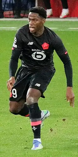 Lille's following season is completely different. After the arrivals of veterans José Fonte and Loïc Rémy, Turkish right-back Zeki Çelik and forwards Jonathan Bamba, Jonathan Ikoné and Rafael Leão, the team proceeded to reel off a string of victories, losing only five games in the first part of the 2018–19 Ligue 1 season. On 14 April 2019, before a record attendance of 49,712 spectators, they defeated Paris Saint-Germain in a historic and storming 5–1 home win with goals from Nicolas Pépé, Jonathan Bamba, Gabriel and team captain José Fonte.[23] At the end of the season, Lille secured the second place to qualify for the 2019–20 UEFA Champions League group stage; they returned to the competition after a seven-year absence.[24] On 1 August 2019, club's season-top scorer Nicolas Pépé is sold to Premier League side Arsenal in a club-record fee of €80 million (£72 million).[25] Lille announced the recruitment of Victor Osimhen and Tiago Djaló on the same day, after the signings of Timothy Weah, Reinildo Mandava and Benjamin André a few weeks earlier. The club then announced the arrivals of Yusuf Yazıcı and Renato Sanches to strengthen the midfield.[26] In early March 2020, the Northmen were in 4th place with 49 points after 28 rounds. However, the Ligue 1 season ended abruptly as the LFP first suspended domestic leagues indefinitely following the outbreak of COVID-19 in France on 13 March, and then definitely cancelled French football competitions a month and a half later.[27]