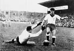 For its first season, the newborn club reached the 1945 Coupe de France final, with a squad composed of the best players of both merging teams, who are mostly natives of the Nord department.[7] Next season, Lille won the double, beating Red Star in the 1946 Coupe de France Final and finishing at the first place of French Division 1 ahead of Saint-Étienne and Roubaix-Tourcoing. In 1947, Lille finished in the fourth place but came back to the Coupe de France final and retained the trophy, defeating Strasbourg. The club won the cup again in 1948 beating main rivals Lens, its third in a row, and were runners-up of the league the same year, behind Marseille that became the champions after a strong 1947–48 season finishing. They were also runners-up in 1948–49, 1949–50 and 1950–51.[7] On 24 June 1951, an exhausted Lille reached the Latin Cup final and lost against Gre-No-Li's AC Milan after having played 250 minutes in the span of two days.[8]
