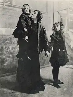 Encouraged by her mother, Lillian Gish began performing when she was five years old. Along with her sister Dorothy, who was three at that time, they became part of a traveling troupe.[12] She made her stage debut in 1902, at the Little Red School House in Risingsun, Ohio. During 1903 to 1904, she toured in Her First False Step, with her mother and Dorothy. In the following year, she danced with a Sarah Bernhardt production in New York City. She later told reporters she had never learned how to play; work was her life, at first due to the poverty she endured as a child, and later because work was what she knew best.[13]