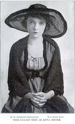 Having acted on stage with her sister as a child, Gish was a prominent film star from 1912 into the 1920s, being particularly associated with the films of director D. W. Griffith. This included her leading role in the highest-grossing film of the silent era, Griffith's The Birth of a Nation (1915). Her other major films and performances from the silent era included Intolerance (1916), Broken Blossoms (1919), Way Down East (1920), Orphans of the Storm (1921), La Bohème (1926), and The Wind (1928).