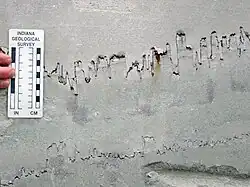 Limestone shows the same range of sedimentary structures found in other sedimentary rocks. However, finer structures, such as lamination, are often destroyed by the burrowing activities of organisms (bioturbation). Fine lamination is characteristic of limestone formed in playa lakes, which lack the burrowing organisms.[76] Limestones also show distinctive features such as geopetal structures, which form when curved shells settle to the bottom with the concave face downwards. This traps a void space that can later be filled by sparite. Geologists use geopetal structures to determine which direction was up at the time of deposition, which is not always obvious with highly deformed limestone formations.[77]
