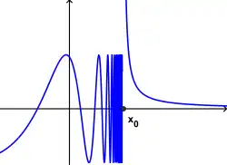 The function has no limit at x0 = 1 (the left-hand limit does not exist due to the oscillatory nature of the sine function, and the right-hand limit does not exist due to the asymptotic behaviour of the reciprocal function, see picture), but has a limit at every other x-coordinate.