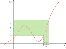 In his 1821 book Cours d'analyse, Augustin-Louis Cauchy discussed variable quantities, infinitesimals and limits, and defined continuity of by saying that an infinitesimal change in x necessarily produces an infinitesimal change in y, while Grabiner claims that he used a rigorous epsilon-delta definition in proofs.[4] In 1861, Karl Weierstrass first introduced the epsilon-delta definition of limit in the form it is usually written today.[5] He also introduced the notations and [6]