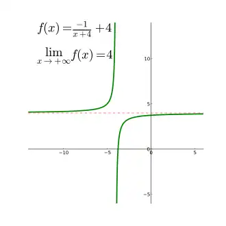 For example, because for every ε > 0, we can take c = 3/ε such that for all real x, if x > c, then |f(x) − 4| < ε.