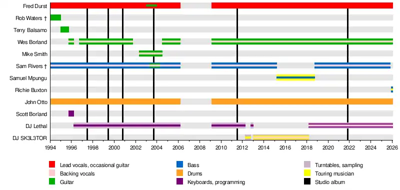 Borland left the group in 2001; however, Durst, Rivers, Otto, and Lethal continued to record and tour with guitarist Mike Smith. Following the release of their fourth album Results May Vary (2003), Borland rejoined the band and recorded the EP The Unquestionable Truth (Part 1) (2005) with Durst, Rivers, Lethal, and drummer Sammy Siegler before entering a hiatus. In 2009, the band once again reunited with Borland playing guitar and began touring, culminating with the recording of the album Gold Cobra (2011), after which it left Interscope and later signed with Cash Money Records; DJ Lethal quit the band soon afterward, returning in 2018. After years of teasing an album tentatively titled Stampede of the Disco Elephants,[4] the band released its sixth studio album Still Sucks on October 31, 2021.[5] Founding bassist Sam Rivers, who was also responsible for recruiting Otto into the band,[6] died in October 2025.[7]