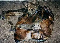 The physical evidence allows a general reconstruction of how Lindow Man was killed, although some details are debated, but it does not explain why he was killed.[55] In North West England, there is little evidence for religious or ritual activity in the Iron Age period. What evidence does survive is usually in the form of artefacts recovered from peat bogs.[56] Late Iron Age burials in the region often took the form of a crouched inhumation, sometimes with personal ornaments. Although dated to the mid-1st century AD, the type of burial of Lindow Man was more common in the pre-historic period.[57] In the latter half of the 20th century, scholars widely believed that bog bodies demonstrating injuries to the neck or head area were examples of ritual sacrifice. Bog bodies were associated with Germanic and Celtic cultures, specifically related to head worship.[58]