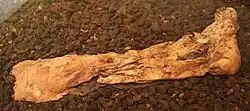 It is not possible to confirm whether some injuries took place before or after death, due to the body's state of decay. This is the case for the wound in the upper right chest and the laceration on the back of the skull.[48] The cut on the right of the neck may have been the result of the body becoming bloated, causing the skin to split, but the straight edges of the wound suggest that it may have been caused by a sharp instrument, such as a knife.[49] The ligature marks on the neck may have occurred after death. In some interpretations of Lindow Man's death, the sinew is a garrotte used to break the victim's neck. However, Robert Connolly, a lecturer in physical anthropology, suggests that the sinew may have been ornamental and that ligature marks may have been caused by the body swelling when submerged. The rib fracture may also have occurred after death, perhaps during the discovery of the body, but is included in some narratives of the Lindow Man's death.[50] The broken neck would have proven the fatal injury, whether caused by the sinew cord tightening around the neck or by blows to the back of the head.[51] After death, Lindow Man was deposited into Lindow Moss face down.[52]