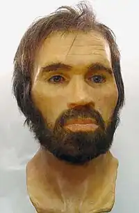 The reconstructed face of Lindow Man. For the process, a replica of his skull was created from radiographs.[24][25]