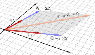In mathematics, a linear combination or superposition is an expression constructed from a set of terms by multiplying each term by a constant and adding the results (e.g. a linear combination of x and y would be any expression of the form ax + by, where a and b are constants).[1][2][3] The concept of linear combinations is central to linear algebra and related fields of mathematics. Most of this article deals with linear combinations in the context of a vector space over a field, with some generalizations given at the end of the article.