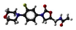 ![Skeletal formula of N-{[(5S)-3-[3-fluoro-4-(morpholin-4-yl)phenyl]-2-oxo-1,3-oxazolidin-5-yl]methyl}acetamide, highlighting the morpholino and fluoro groups in orange, with the rest in blue. The carbon atoms of the parent chain are numbered.](./_assets_/0c70a452f799bfe840676ee341124611/Linezolid_showing_oxazolidinone_pharmacophore.svg.png)