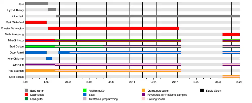 Linkin Park is an American rock band formed in Agoura Hills, California, in 1996. The band's current lineup consists of vocalist/rhythm guitarist/keyboardist Mike Shinoda, lead guitarist Brad Delson, DJ/turntablist Joe Hahn, bassist Dave Farrell, vocalist Emily Armstrong, and drummer Colin Brittain. The lineup for the band's first seven studio albums included lead vocalist Chester Bennington and drummer Rob Bourdon; after Bennington's suicide in July 2017, the band endured a seven-year hiatus, during which Bourdon chose to depart from the band. In September 2024, Linkin Park's reformation was announced along with the addition of Armstrong and Brittain.