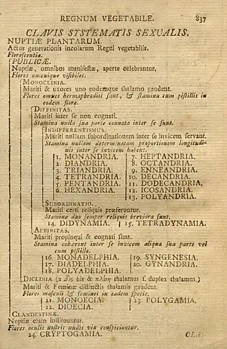 In Systema Naturae (1735), his classes and orders of plants, according to his Systema Sexuale, were not intended to represent natural groups (as opposed to his ordines naturales in his Philosophia Botanica) but only for use in identification. However, in 1737 he published Genera Plantarum in which he claimed that his classification of genera was a natural system.[3] His botanical classification and sexual system were used well in the nineteenth century.[4] Within each class were several orders. This system is based on the number and arrangement of male (stamens) and female (pistils) organs.[5]
