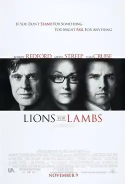 Lions for Lambs is a 2007 American war drama film directed by Robert Redford about the connection between a platoon of United States soldiers in Afghanistan, a U.S. senator, a reporter, and a Californian college professor. It stars Redford, Tom Cruise, Meryl Streep, and Andrew Garfield in his feature film debut. It was the first Cruise/Wagner Productions film since the company joined with United Artists subsequent to Cruise's falling out with Paramount Pictures in 2006.[5]