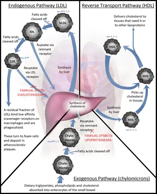 Hydrolysis by hepatic lipase releases glycerol and fatty acids, leaving behind IDL remnants, called low-density lipoproteins (LDL), which contain a relatively high cholesterol content[5] (see native LDL structure at 37°C on YouTube). LDL circulates and is absorbed by the liver and peripheral cells. Binding of LDL to its target tissue occurs through an interaction between the LDL receptor and apolipoprotein B-100 on the LDL particle. Absorption occurs through endocytosis, and the internalized LDL particles are hydrolyzed within lysosomes, releasing lipids, chiefly cholesterol.