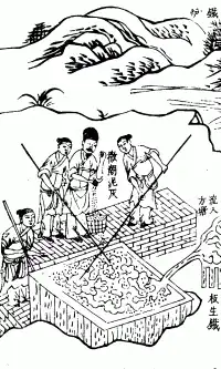 - Finery forge: In addition to accidental lumps of low-carbon wrought iron produced by excessive injected air in Chinese cupola furnaces, the ancient Chinese also created wrought iron by using the finery forge at least by the 2nd century BC, the earliest specimens of cast and pig iron fined into wrought iron and steel found at the early Han dynasty (202 BC – 220 AD) site at Tieshenggou.[194] Pigott speculates that the finery forge existed in the previous Warring States period (403–221 BC), because there are wrought iron items from China dating from that period and there is no documented evidence that the bloomery was ever used in China.[195] The fining process involved liquifying cast iron in a fining hearth and removing carbon from the molten cast iron through oxidation.[194] Wagner writes that, in addition to the Han dynasty hearths, believed to be fining hearths, there is also pictorial evidence of the fining hearth from a Shandong tomb mural dated to the 1st or 2nd century AD, along with a hint of written evidence in a Daoist text from the 4th century AD, Taiping Jing.[196]
