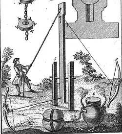- Drilling rig: The technique of percussion drilling for oil and gas originated during the ancient Chinese Han dynasty, when percussion drilling ("churn drilling") was used to extract natural gas in Sichuan province.[175][176] Iron bits were fastened to long bamboo poles, which were centered within a bamboo derrick. The poles were repeatedly hoisted, using cables woven from bamboo fiber. With the assistance of levers, very heavy bits could be raised, of sufficient weight to percussively bore through rock when repeatedly dropped.[175] Han dynasty oil wells were about 10 meters deep; by the 10th century, depths of 100 meters could be achieved.[175] By the 16th century, Chinese oil prospectors were using percussion drilling to create wells over 2000 feet deep.[176] A modernized variant of the technique was used by American businessman Edwin Drake to drill Pennsylvania's first oil well in 1859, using small steam engines to power the drilling process.[175]