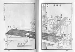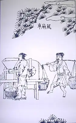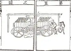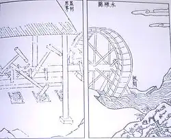 - Field mill: In the Yezhongji ('Record of Affairs at the Capital Ye of the Later Zhao Dynasty') written by Lu Hui (fl. 350 AD), various mechanical devices are described which were invented by two Later Zhao (319–351) engineers known as Xie Fei, a Palace Officer, and Wei Mengbian, the Director of the Imperial Workshops.[190] One of these is the field mill, which was essentially a cart with millstones placed onto the frame; these were mechanically rotated by the movement of the cart's terrain wheels in order to grind wheat and other cereal crops.[191] A similar vehicle these two invented was the "pounding cart", which had wooden statues mounted on the top which were actually mechanical figures who operated real tilt hammers in order to hull rice; again, the device only functioned when the cart was moved forward and the wheels turned.[191] The field mill lost its use in China sometime after the Later Zhao, but it was invented separately in Europe in 1580 by the Italian military engineer Pompeo Targone.[192] It was featured in a treatise by the Italian engineer and writer Vittorio Zonca in 1607, and then in a Chinese book of 1627 (concerning European technology) that was compiled and translated by the German Jesuit polymath Johann Schreck (1576–1630) and the Ming dynasty (1368–1644) Chinese author Wang Zheng (王徵 1571–1644), although by then it was considered by the Chinese to be an original Western contraption.[193]