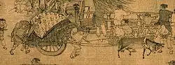 - Horse harness: Throughout the ancient world, the 'throat-and-girth' harness was used for harnessing horses that pulled carts; this greatly limited a horse's ability to exert itself as it was constantly choked at the neck.[262] A painting on a lacquerware box from the State of Chu, dated to the 4th century BC, shows the first known use of a yoke placed across a horse's chest, with traces connecting to the chariot shaft.[263] The hard yoke across the horse's chest was gradually replaced by a breast strap, which was often depicted in carved reliefs and stamped bricks of tombs from the Han dynasty (202 BC – 220 AD).[264] Eventually, the horse collar was invented in China, at least by the 5th century.[259][265]