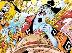 Jimbei (ジンベエ, Jinbē), known by the epithet of "First Son of the Sea" Jinbe (侠のジンベエ, Kaikyō no Jinbē; lit. "Knight of the Sea" Jinbe), is a yakuza-esque whale shark-type fish-man.[ch. 528] A master of Fish-Man Karate (魚人空手, Gyojin Karate) and Fish-Man Jujutsu (魚人柔術, Gyojin Jūjutsu), he is capable of manipulating water as if it were a tangible cloth.[ch. 546] Jimbei can communicate with fish, an ability more usually associated with merfolk, allowing him to enlist the help of whale sharks.[ch. 547–549] After growing up in a rough part of Fish-Man Island, Jimbei first joins the island's royal army and later the Sun Pirates; he becomes captain following the death of Fisher Tiger.[ch. 624] In exchange for the World Government granting him Warlord-status and amnesty to the Sun Pirates, Jimbei disbands the crew.[ch. 69] He resigns from the position to side against the Government during its war with the Whitebeard Pirates, the protectors of Fish-Man Island, and is subsequently imprisoned in Impel Down.[ch. 557] He is then freed by Luffy during his mission to rescue Ace.