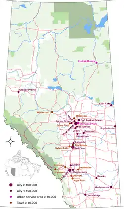 To qualify as a city in Alberta, a sufficient population size (10,000 people or more) must be present and a majority of the buildings must be on parcels of land less than 1,850 square metres (19,900 sq ft).[1] A community is not always incorporated as a city even if it meets these requirements. The urban service areas of Fort McMurray and Sherwood Park are hamlets recognized as equivalents of cities, but remain unincorporated. Ten towns are also eligible for city status but remain incorporated as towns.