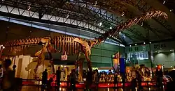 Mounted skeletons of Tyrannosaurus (left) and Apatosaurus (right) at the AMNH
