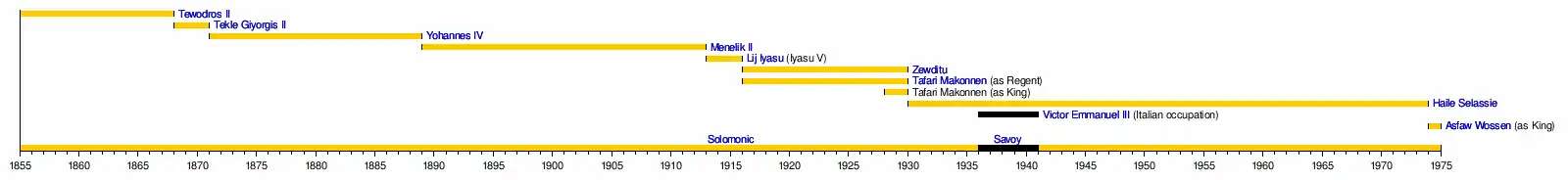 - ^ Previously King of Shewa from 1855 to 1856, and from 1865 to 1889. Ruled under the regency of Ras Betwoded Tessema Nadew from 1909 to 1911 and Lij Iyasu from 1911 to 1913.