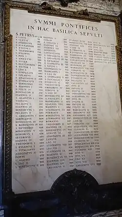 - ^ The List of Popes Archived 9 May 2012 at the Wayback Machine. The Catholic Encyclopedia, 1911. The exception is Saint Peter, who is given the traditional death date of AD 67.