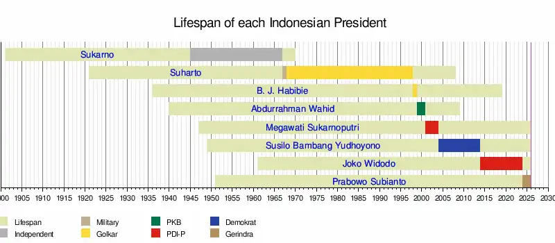 | First president from a military background. The longest-serving president with an over-30-year tenure. Seized power from Sukarno through Supersemar in 1966. Declared a New Order military dictatorship. Dismantled the Communist Party of Indonesia and oversaw the mass murder and imprisonment of thousands of suspected communists throughout the archipelago. Ended Konfrontasi and initiated friendly relationships with neighbouring countries of Malaysia and Singapore, and Indonesia became a founding member of the Association of Southeast Asian Nations and the Asia-Pacific Economic Cooperation. Severed ties with China and other communist countries in the region. Incorporated Western New Guinea into Indonesia. Annexed East Timor. Oversaw great economic and infrastructural development but rampant corruption within the bureaucracy and government. Resigned following the collapse of the Indonesian economy during the 1997 financial crisis and the 1998 riots. | |||||||||