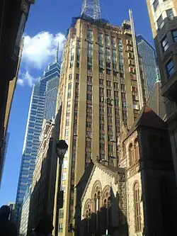Philadelphia has an extensive history of tall structures, generally thought to have begun with the 1754 addition of the steeple to Christ Church.[6] The Philadelphia City Hall was the first building in the world to surpass a height of 500 ft (152 m) when it topped out in 1894, and remained the world's tallest building until 1908. Philadelphia had one of the largest pre-war construction booms in the United States, having built 18 buildings taller than 300 ft (91 m) by the early 1930s, the most of any city in the world besides New York City and Chicago. The Great Depression and World War II halted skyscraper development until the late 1950s. From the 1960s to 1980s, Philadelphia added a large number of office buildings to its skyline in a second boom. For most of the 20th century, a "gentlemen's agreement" imposed an unofficial height limit, restricting the height of any new skyscraper below that of the 548-foot (167 m) Philadelphia City Hall.[7]