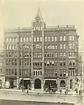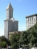 After the Great Seattle Fire of June 6, 1889, Seattle began reconstruction of the city's central business district under a new building code requiring the use of fireproof materials, such as stone and brick. By the end of 1890, 465 buildings had been built, completing the initial phase of reconstruction, and city boosters looked to build modern high-rise buildings after the infusion of new money from the Klondike Gold Rush later that decade.[5][6] The Pioneer Building, whose observation tower surpassed 110 feet (34 m), was completed in 1892 and is regarded as the city's first modern high-rise building.[12][19] The Alaska Building, completed in 1904 and rising 203 feet (62 m) above 2nd Avenue in Pioneer Square, is considered to be Seattle's first skyscraper and first steel-framed high-rise building. It held the title of tallest habitable building in the city until the completion of the 205-foot (62 m), 18-story Hoge Building in 1911.[20][21] Both buildings had been surpassed in height by the clocktower of King Street Station, opened in 1906, which stands 245 feet (75 m) tall.[22]