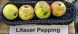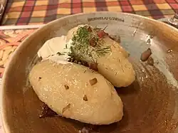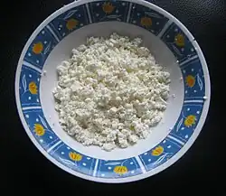 The traditional Lithuanian curd cheese Lietuviškas varškės sūris has been registered as a Protected Geographical Indication (PGI) in the EU and UK.[21] The most popular way of eating Lithuanian non-fermented white cheese is with fresh honey; it can also be cooked with spices and enjoyed with tea. Food historians estimate that the curd cheese was known for 4-6 thousands of years.[22] Lithuanians started fermenting hard cheese around the 16th century in the region of Samogitia. Across Samogitian borders, this cheese was known as Lithuanian cheese. Historically there were not many varieties of cheese in Lithuania, due to low levels of lactose intolerance. Milk products were usually consumed fresh, or slightly fermented. Semi-hard cheese Liliputas in 2015 was registered as an EU Protected Geographical Indication (PGI).[23] Hard cheese Džiugas ripens for at least 12 months, is popular among gourmets and being used as to flavour recipes. Džiugas in 2019 was registered as a Protected Geographical Indication. In the interwar period Šėta was famous for its cheese, which was made in sūrinė (cheese house). Small family farms throughout Lithuania also producing various types of artisan cheeses being sold in eco and farmer markets, restaurants.