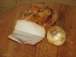 - Lašiniai (lard) – (smoked non-rendered pork underskin fat with a small layer of meat of or without it) is a popular appetizer in villages where it is produced locally, and is usually consumed in the form of a sandwich with unbuttered dark rye bread and bulb onions, horseradish or other vegetables and condiments. Spirgai (cracklings) are made from lard for various sauces similar to gravy. One can find various types of lašiniai in every butcher shop or shop mall in Lithuania.