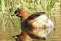 Like all grebes, it nests at the water's edge, since its legs are set very far back and it cannot walk well. Usually four to seven eggs are laid. When the adult bird leaves the nest it usually takes care to cover the eggs with weeds. This makes it less likely to be detected by predators.[9] The young leave the nest and can swim soon after hatching, and chicks are often carried on the backs of the swimming adults.[10] In India, the species breeds during the rainy season.[11]