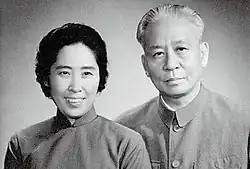 Liu married five times, including to He Baozhen (何宝珍) and Wang Guangmei (王光美).[33] His third wife, Xie Fei (谢飞), came from Wenchang, Hainan and was one of the few women on the 1934 Long March.[34] His wife at the time of his death in 1969, Wang Guangmei, was thrown into prison by Mao Zedong during the Cultural Revolution; she was subjected to harsh conditions in solitary confinement for more than a decade.[35]