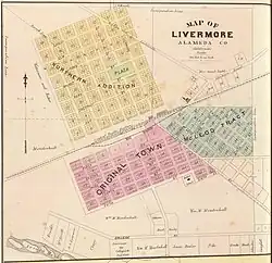 Livermore's founder, William Mendenhall, was another landowner in the Livermore Valley, having bought 650 acres of the Santa Rita grant and 608 acres of the Rancho Valle de San José.[23] In 1869, he set aside 100 acres (40 ha) of his land for a townsite, creating a new town which he named Livermore, after his friend Robert Livermore.[17] Livermore was platted and registered on November 4, 1869, as a railroad town.[24] By that time, the valley had already become known as Livermore's Valley.[15] He had first met Livermore while marching through the valley with John C. Fremont's California Battalion in 1846 as they were recruited to occupy the surrendering Californio towns captured by the U.S. Navy's Pacific Squadron.[25] He also donated 20 acres (8.1 ha) of this land to the Western Pacific Railroad,[17] which in September 1869 placed a station on the land William Mendenhall had donated.[26] The land for the tracks had already been signed over by Robert Livermore from his ranch in 1855, as surveyors had determined it was the best place to build.[27] The original railroad tracks went from Alameda Terminal to Sacramento over the nearby Altamont Pass in the east and Niles Canyon on the west.