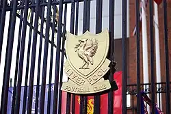 The Liverpool badge is based on the city's liver bird symbol, which in the past had been placed inside a shield. In 1977, a red liver bird standing on a football (blazoned as "Statant upon a football a Liver Bird wings elevated and addorsed holding in the beak a piece of seaweed gules") was granted as a heraldic badge by the College of Arms to the English Football League intended for use by Liverpool. However, Liverpool never made use of this badge.[71] In 1992, to commemorate the centennial of the club, a new badge was commissioned, including a representation of the Shankly Gates. The next year twin flames were added at either side, symbolic of the Hillsborough memorial outside Anfield, where an eternal flame burns in memory of those who died in the Hillsborough disaster.[72] In 2012, Warrior Sports' first Liverpool kit removed the shield and gates, returning the badge to what had adorned Liverpool shirts in the 1970s; the flames were moved to the back collar of the shirt, surrounding the number 96 for the number who died at Hillsborough.[73] Following the death of Andrew Devine, and the subsequent ruling by a coroner that he was also unlawfully killed, the number 97 has been worn in this place since the beginning of the 2022–23 season.[74]
