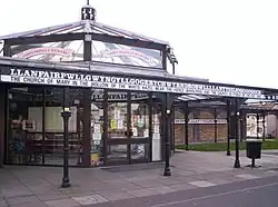 A few thousand local residents welcome about 200,000 visitors per year.[26] The most popular attraction is the Llanfairpwll railway station that features the plate with the full name of the village. Other places of interest in the area include Anglesey Sea Zoo, Bryn Celli Ddu Burial Chamber, St. Tysilio's Church, and Plas Cadnant Hidden Gardens.[27]