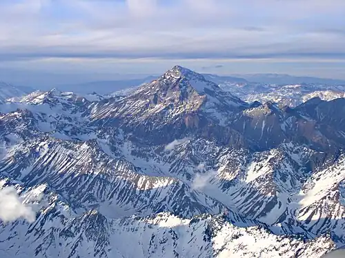 The volcano is an imposing mountain, rising by 3,800 m and 3,750 m above the Salar de Punta Negra and the Salar de Llullaillaco, 36 km and 20 km away, respectively.[24][26] With a summit height of 6,723 m,[1][27][28] (or 6,739 m[2]) it is one of the highest mountains in the Andes[14] (third highest in Chile[7] and seventh highest in the Andes, according to John Biggar[29]) and the second-[1] or third-highest volcano in the world[13] (Ojos del Salado is the highest[27]). In the early 20th century, Llullaillaco was thought to be the highest volcano in the world.[30] The elevation is to a large degree consequence of the underlying terrain, which rises about 4 km above sea level.[31] The height of the mountain and the clear air in the region make Llullaillaco visible from Cerro Paranal, 190 km away as measured through Google Earth.[32] The view from the mountain extends from Licancabur north over the Nevados de Cachi mountains east to[6] Ojos del Salado 250 km south;[33] mountains in between are visible as well.[6]