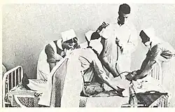 On 12 November 1935 at the Hospital de Santa Marta in Lisbon, Moniz initiated the first of a series of operations on the brains of people with mental illnesses.[98] The initial patients selected for the operation were provided by the medical director of Lisbon's Miguel Bombarda Mental Hospital, José de Matos Sobral Cid.[99] As Moniz lacked training in neurosurgery and his hands were impaired by gout, the procedure was performed under general anaesthetic by Pedro Almeida Lima, who had previously assisted Moniz with his research on cerebral angiography.[n 12][101] The intention was to remove some of the long fibres that connected the frontal lobes to other major brain centres.[102] To this end, it was decided that Lima would trephine into the side of the skull and then inject ethanol into the "subcortical white matter of the prefrontal area"[97] so as to destroy the connecting fibres, or association tracts,[103] and create what Moniz termed a "frontal barrier".[n 13][104] After the first operation was complete, Moniz considered it a success and, observing that the patient's depression had been relieved, he declared her "cured" although she was never, in fact, discharged from the mental hospital.[105] Moniz and Lima persisted with this method of injecting alcohol into the frontal lobes for the next seven patients but, after having to inject some patients on numerous occasions to elicit what they considered a favourable result, they modified the means by which they would section the frontal lobes.[105] For the ninth patient they introduced a surgical instrument called a leucotome; this was a cannula that was 11 centimetres (4.3 in) in length and 2 centimetres (0.79 in) in diameter. It had a retractable wire loop at one end that, when rotated, produced a 1 centimetre (0.39 in) diameter circular lesion in the white matter of the frontal lobe.[106] Typically, six lesions were cut into each lobe, but, if they were dissatisfied by the results, Lima might perform several procedures, each producing multiple lesions in the left and right frontal lobes.[105]