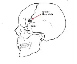 Site of borehole for the standard pre-frontal lobotomy/leucotomy operation as developed by Freeman and Watts