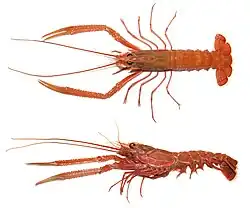 Although several other groups of crustaceans have the word "lobster" in their names, the unqualified term "lobster" generally refers to the clawed lobsters of the family Nephropidae.[4] Clawed lobsters are not closely related to langustas (spinys and slipper lobsters), which have no claws (chelae), or to squat lobsters. The most similar living relatives of clawed lobsters are the reef lobsters and the three families of freshwater crayfish.