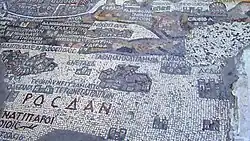 The Church of Saint George and Mosque of Al-Khadr is named for him.[31] The 6th-century Madaba map shows Lydda as an unwalled city with a cluster of buildings under a black inscription reading "Lod, also Lydea, also Diospolis".[47] An isolated large building with a semicircular colonnaded plaza in front of it might represent the St George shrine.[48]